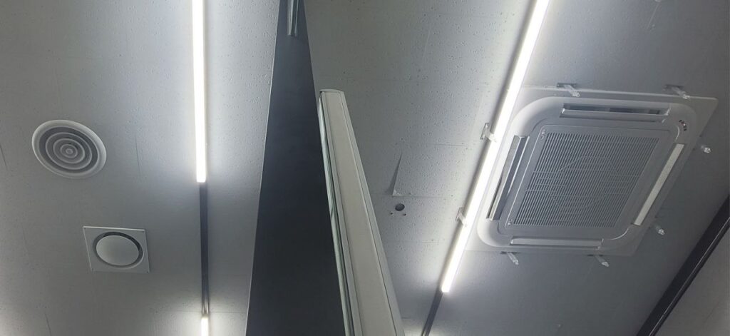 오른쪽에 있는 4웨이 실내기에서 서브덕트로 디퓨저까지 연결 되어있다. 실내기와 디퓨저 사이 거리는 대략 3미터 쯤 되는 것 같다.