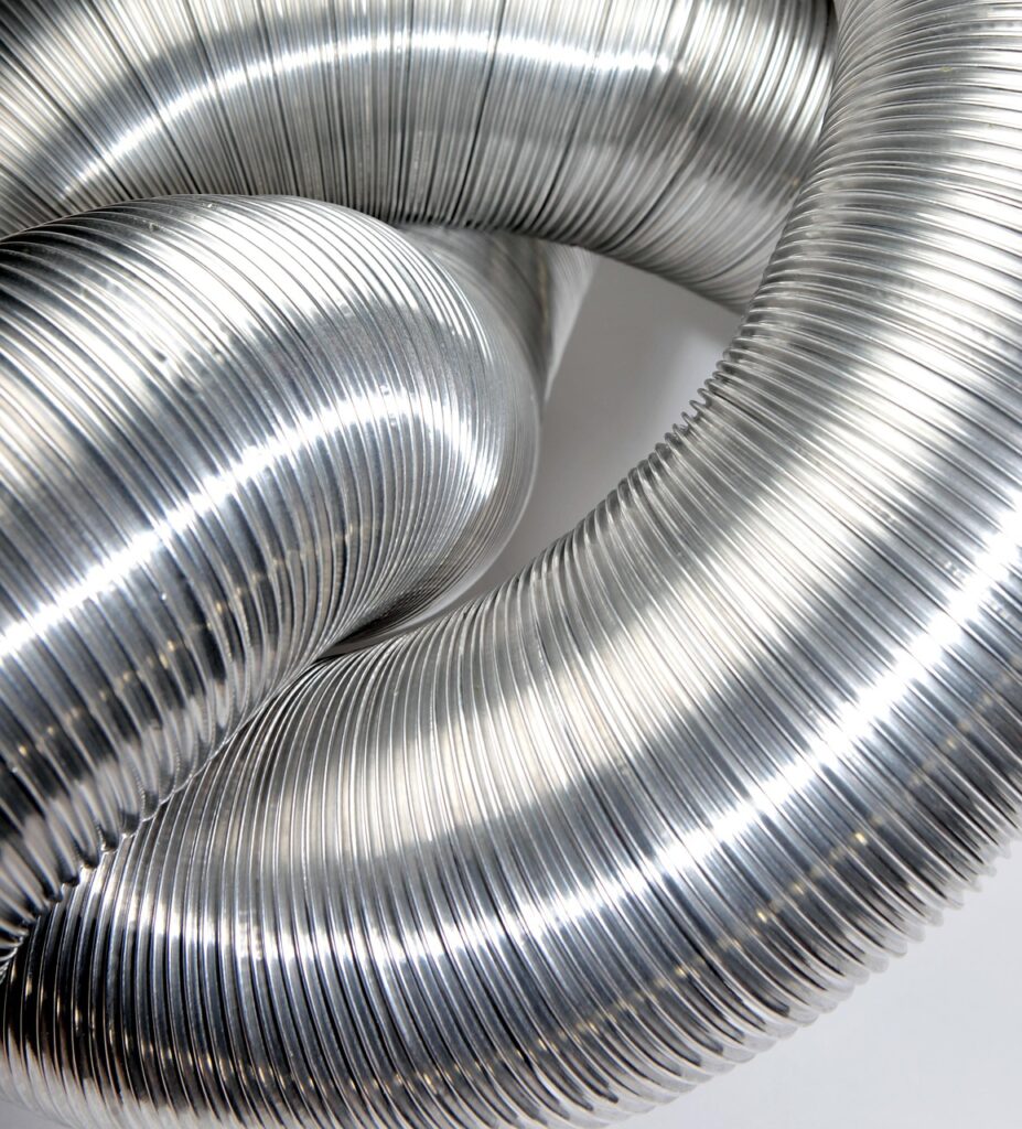 실내기 연결 어댑터와 찬바람이 나오는 디퓨저 사이에는 이런 주름관이 천장 속으로 들어간다. 찬바람이 지나가면 이것도 차가워지므로 사진에 있는 것 같은 일반 주름관을 쓰면 물방울이 맺히고 그 물이 천장에 떨어지면 누수가 생긴 것과 같은 현상이 일어날 수 있다. 그래서 반드시 보온재로 밖을 감싼 주름관을 써야 한다.
