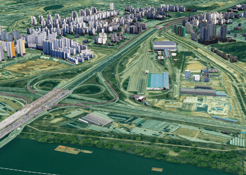 한강 쪽에서 바라보는 고덕차량기지다. 왼쪽 빈터는 토지임대부주택 자리고 수도권제1순환고속도로와 비즈밸리 사이에 있다.