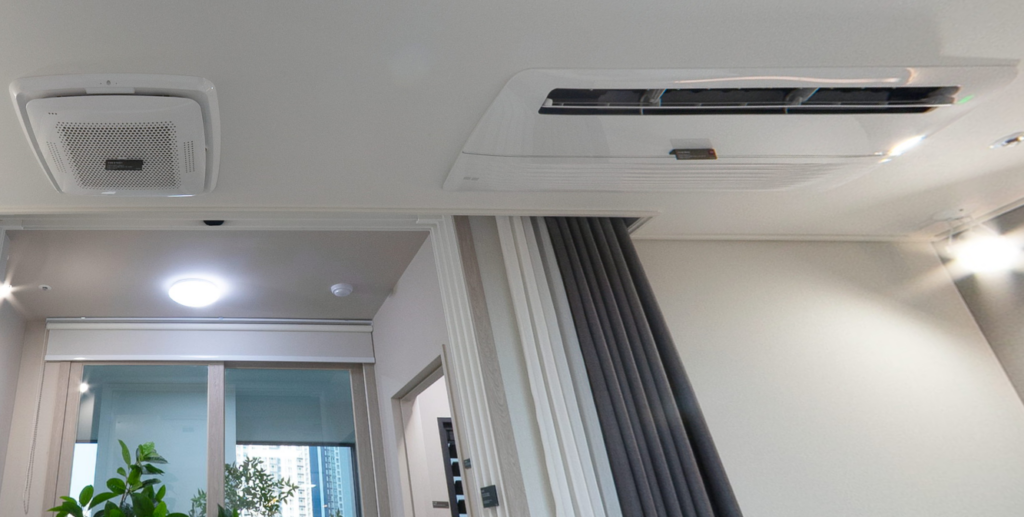 모델 하우스 천장 에어컨 옆에 붙어있었는데, 사진으로는 왼쪽이다.