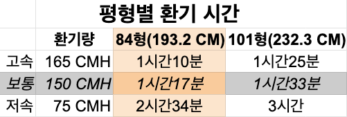 CMH는 Cubic Meter Hour를 줄인말인데 시간당 환기하는 공기의 부피를 나타낸다. 기본 용량으로 돌리면 84형은 1시간 17분, 101형은 1시간 반 정도면 집안 전체 공기가 환기 된다고 볼 수 있다.