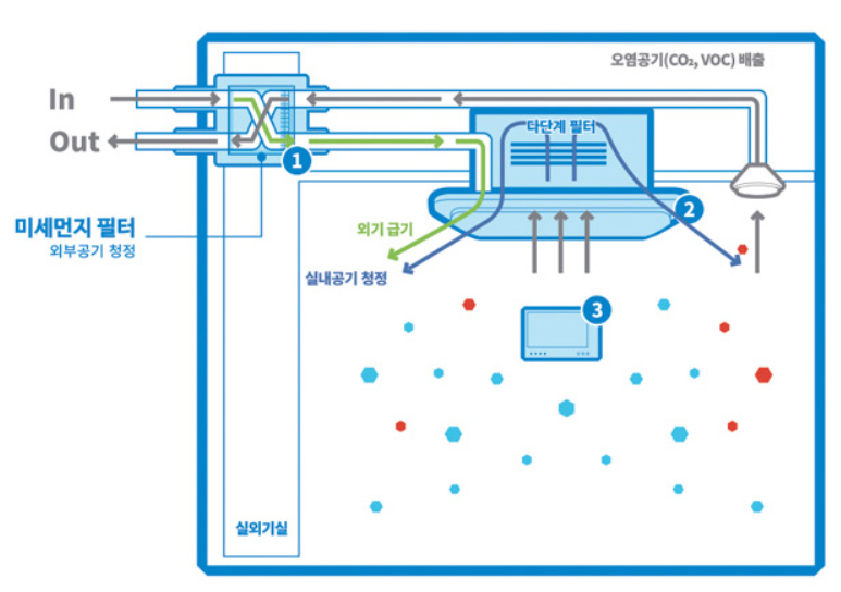 일반 공기청정기는 실내 미세먼지는 제거할 수 있지만, 밖에서 들어오는 미세먼지는 어쩔 수 없다. 밖에서 들어오는 미세먼지를 줄이려고 창문을 닫아두면 실내에는 이산화탄소, 라돈 가스, 휘발성 유기화합물질(VOCs)의 농도가 높아진다. 휘발성 유기화합물질은 새집증후군의 주요인자로 알려져있다.